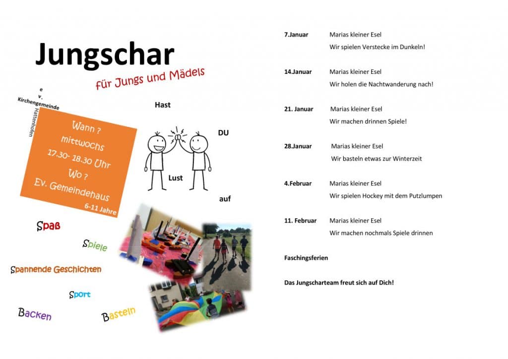 Die Jungschar für Jungen und Mädchen im Alter von 6 – 12 Jahren trifft sich mittwochs von 17:30-18:30 Uhr im Jugendraum des Gemeindehauses zum Spielen, Basteln, Backen und Hören biblischer Geschichten. Wenn du Lust hast zu kommen, dann schau doch einfach mal vorbei. Das Jungschar-Team freut sich auf Dich!